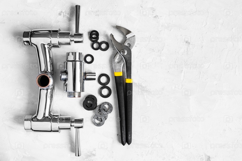 Вид сверху на гаечный ключ, клапан крана с копией пространства