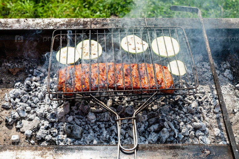 Свиные ребрышки с нарезанными цукини на углях