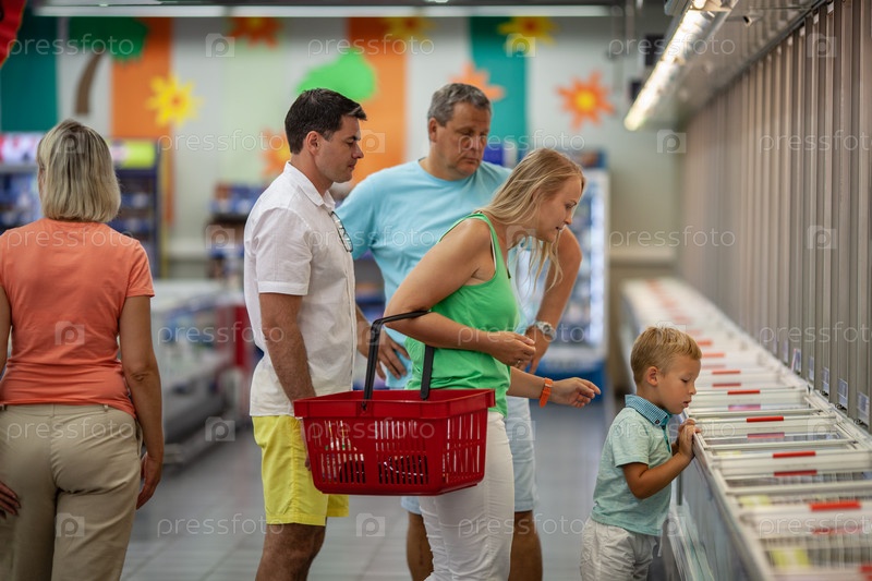 Семья делает покупки в супермаркете