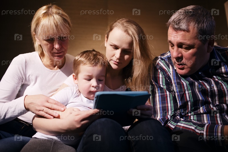 Семья смотрит, как мальчик играет в игру на тачпаде