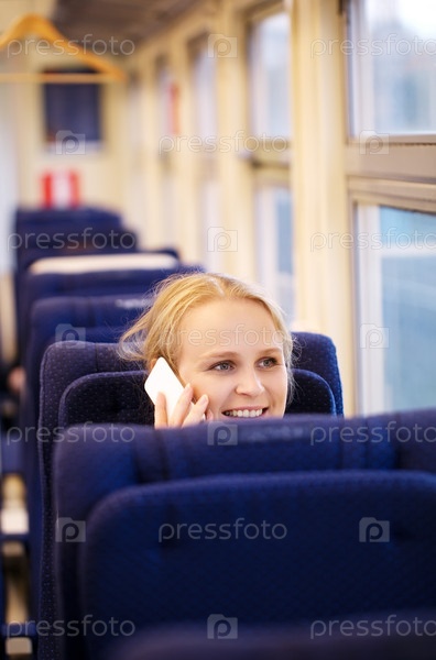 Улыбающаяся женщина разговаривает по телефону в поезде