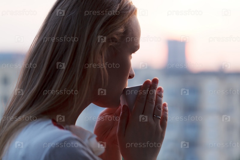 Девушка пьет кофе ранним утром