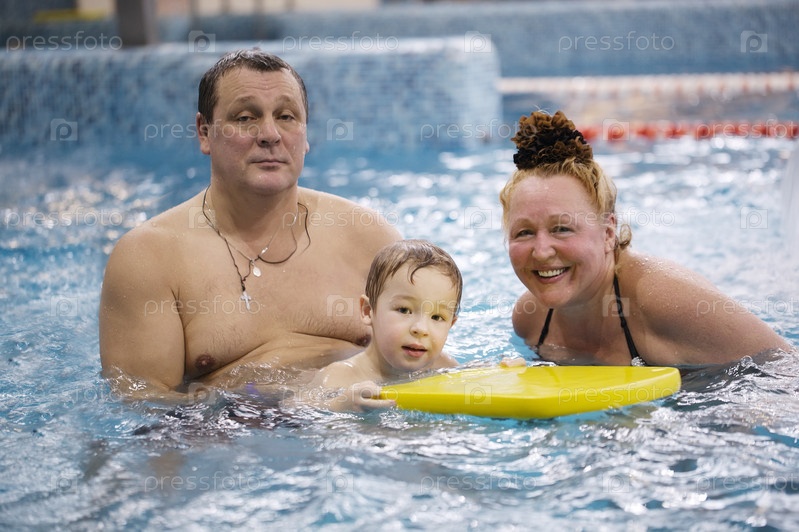 Бабушка и дедушка и внук в бассейне