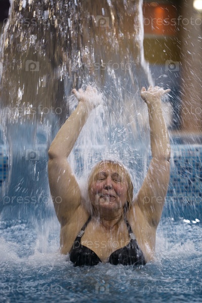 Женщина плещется в бассейне под струей воды