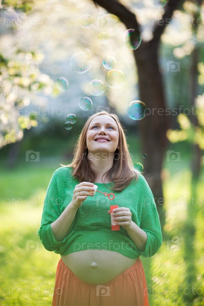 Счастливая беременная женщина и пузыри на открытом воздухе