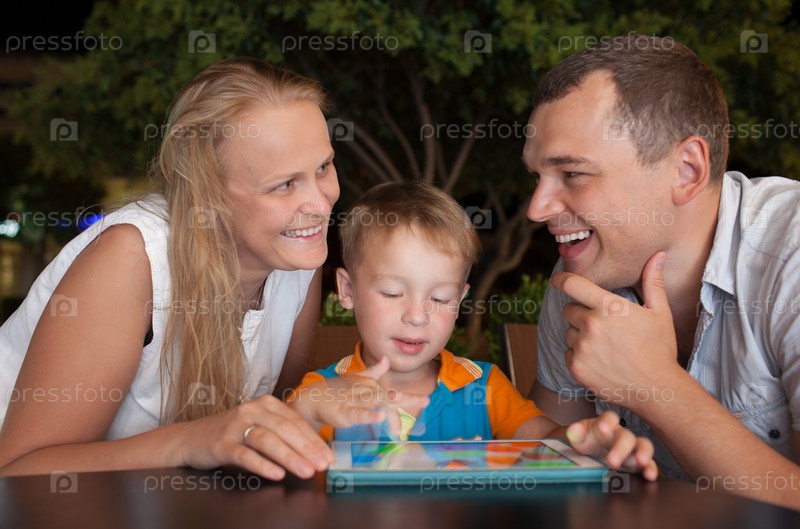 Счастливая семья с планшетным ПК на открытом воздухе вечером
