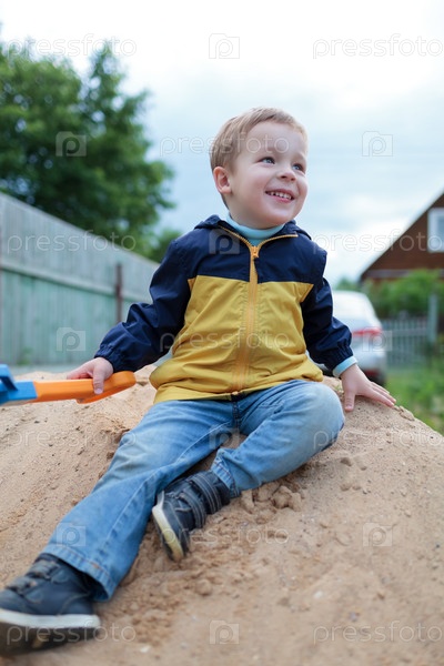 Счастливый маленький мальчик сидит на песчаном холме