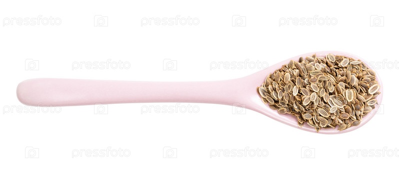 Вид сверху на керамическую ложку с изолированными семенами укропа