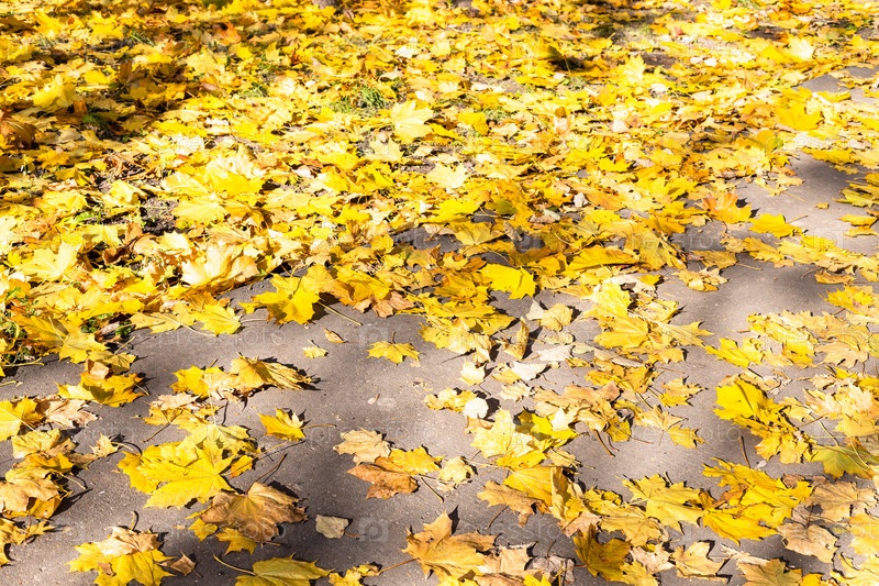 Залитые солнцем опавшие желтые кленовые листья на городской тропинке