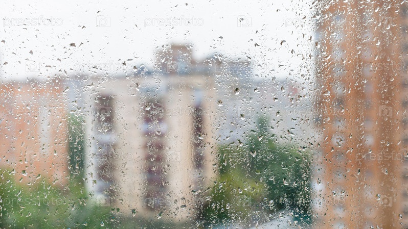 Капли дождя на оконном стекле и размытом городском пейзаже