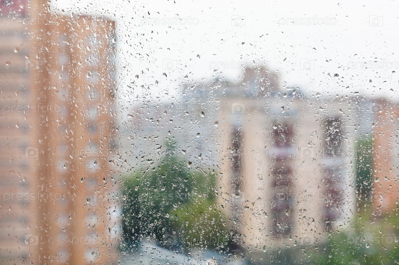 Капли дождя на оконном стекле и размытый городской пейзаж