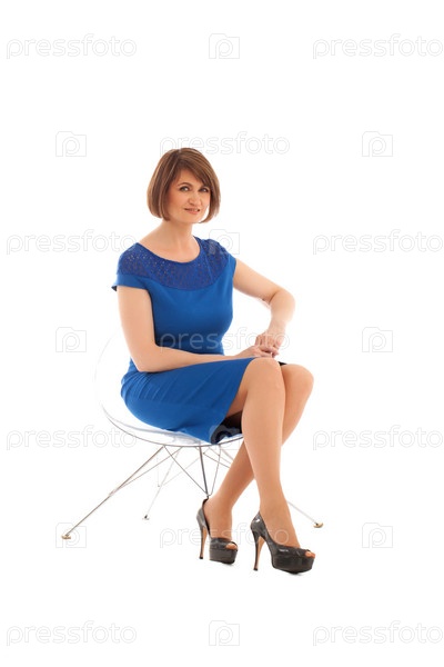 Коротко стриженная женщина сидит на прозрачном стуле