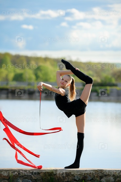 Художественная гимнастка в вертикальном шпагате с лентой
