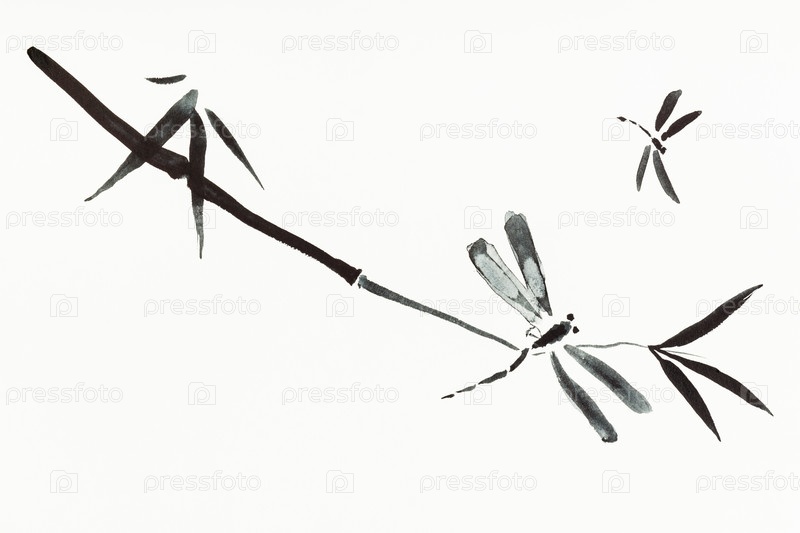 Стрекозы и веточка нарисованы от руки на бумаге