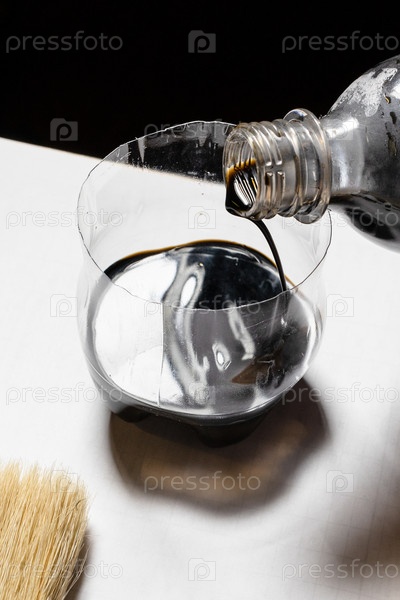 Выливание морилки из бутылки в банку крупным планом