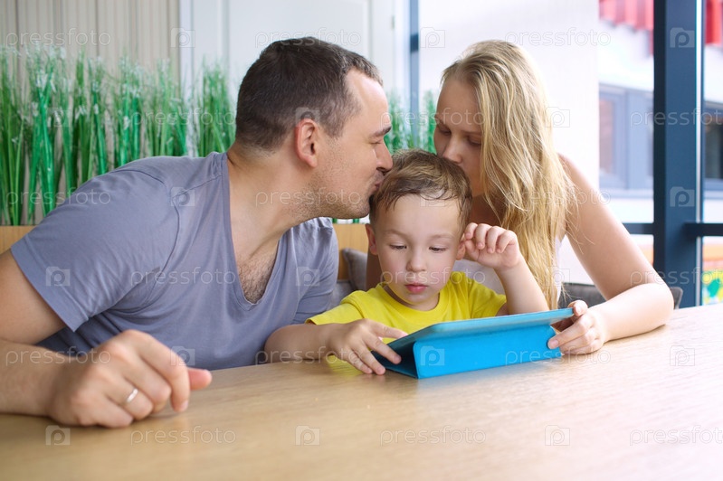 Родители целуют сына, играющего на планшете