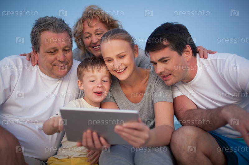 Счастливая семья проводит время с планшетом на открытом воздухе