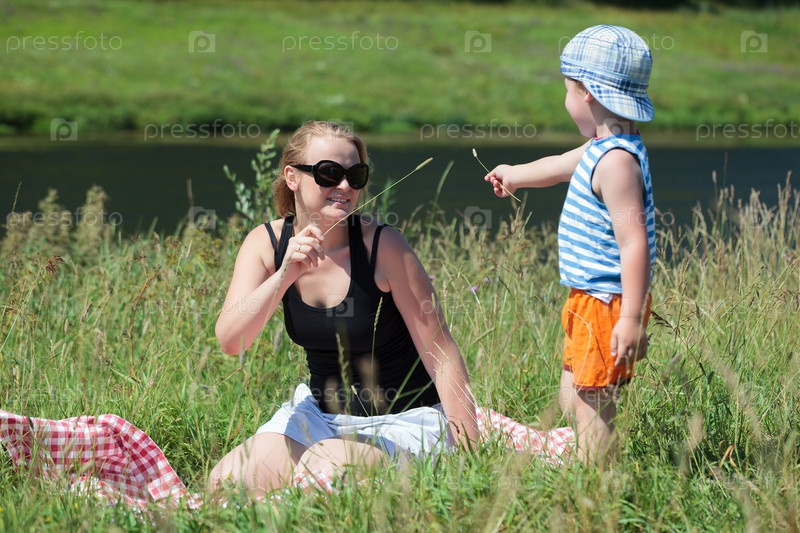 Мать и сын играют с травой на лугу