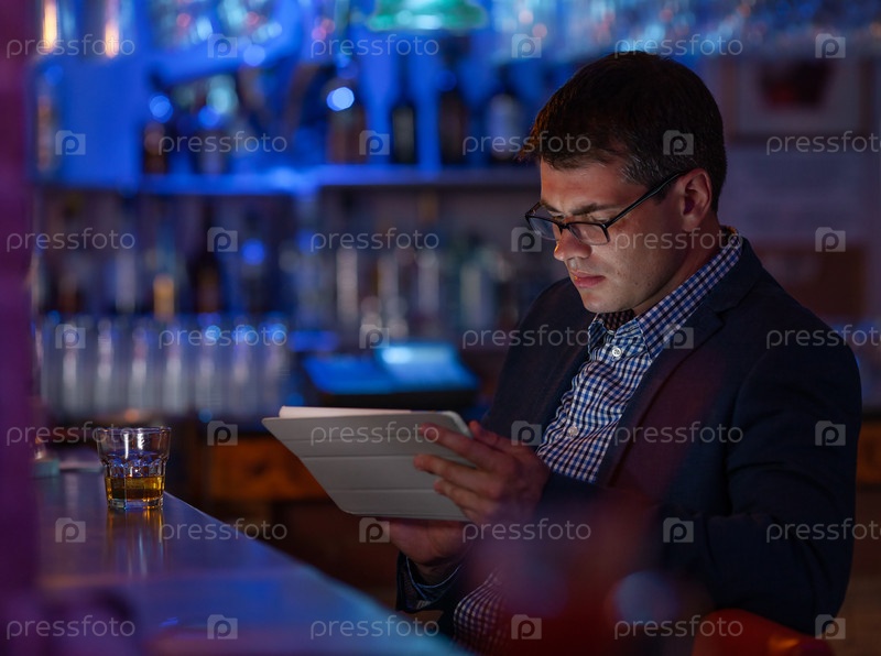 Бизнесмен с планшетным ПК и виски за барной стойкой