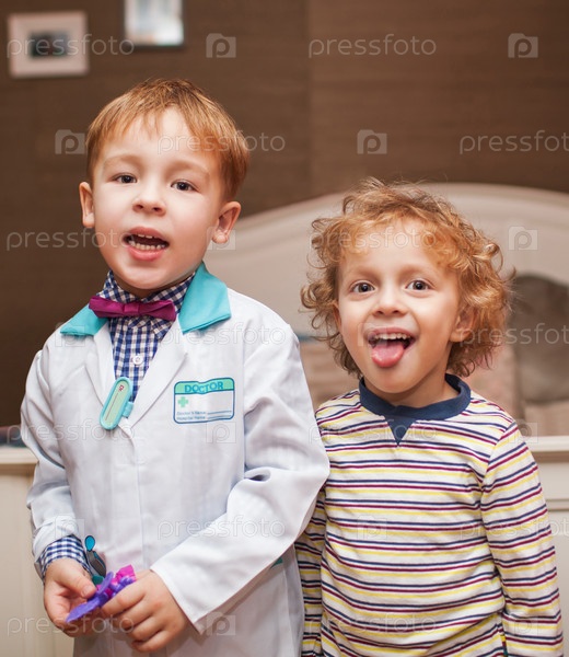 Маленький доктор и его пациент показывают язык