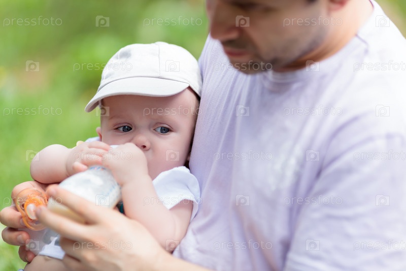 Отец кормит ребенка из бутылочки