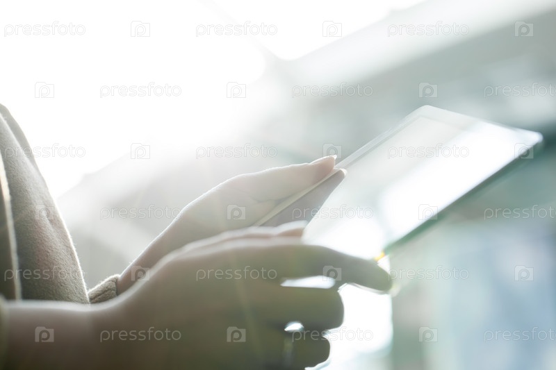 Женщина с помощью планшетного ПК против яркого солнечного света
