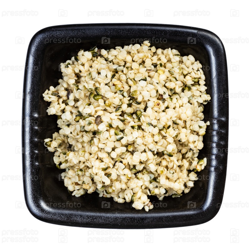 Ядра семян конопли в черной миске изолированы