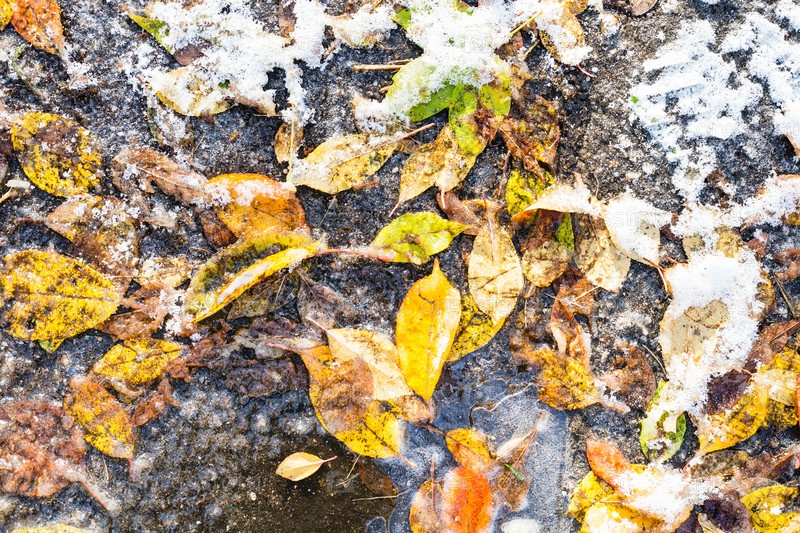 Различные красочные опавшие листья, застывшие в луже
