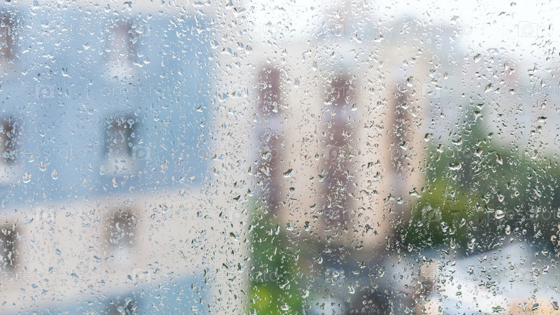 Капли дождя на окне и размытые жилые дома