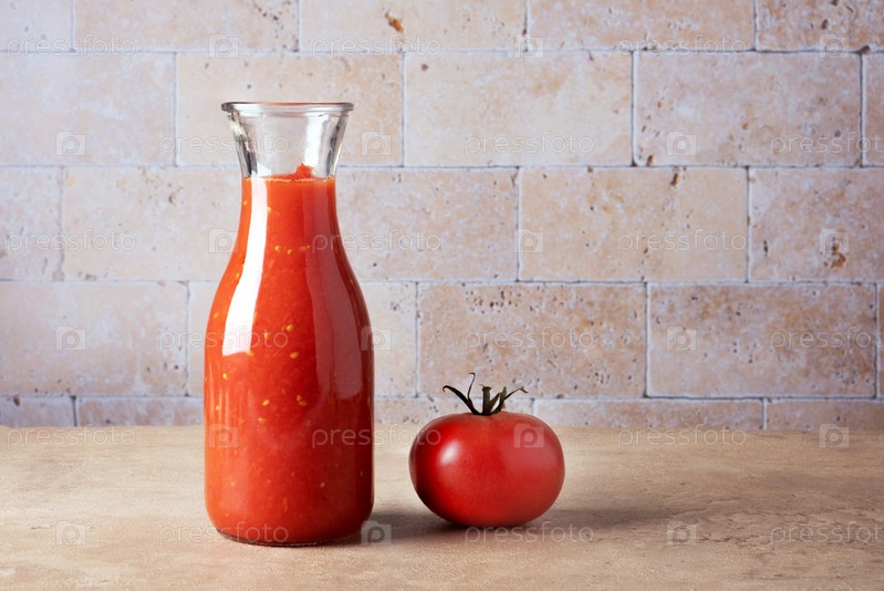 Стеклянная бутылка с домашним томатным соусом и спелыми помидорами на столе
