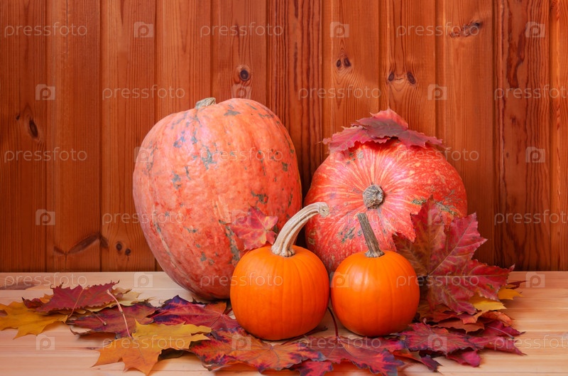 Оранжевые тыквы и кленовые листья на деревянном фоне