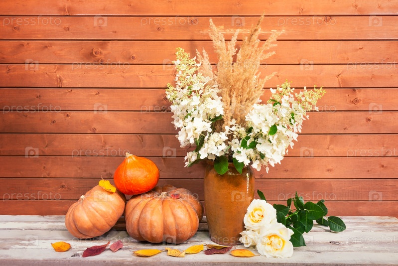 Белые цветы гортензии и сухая трава в глиняной вазе, тыквы, белые розы и осенние листья на состаренном деревянном столе