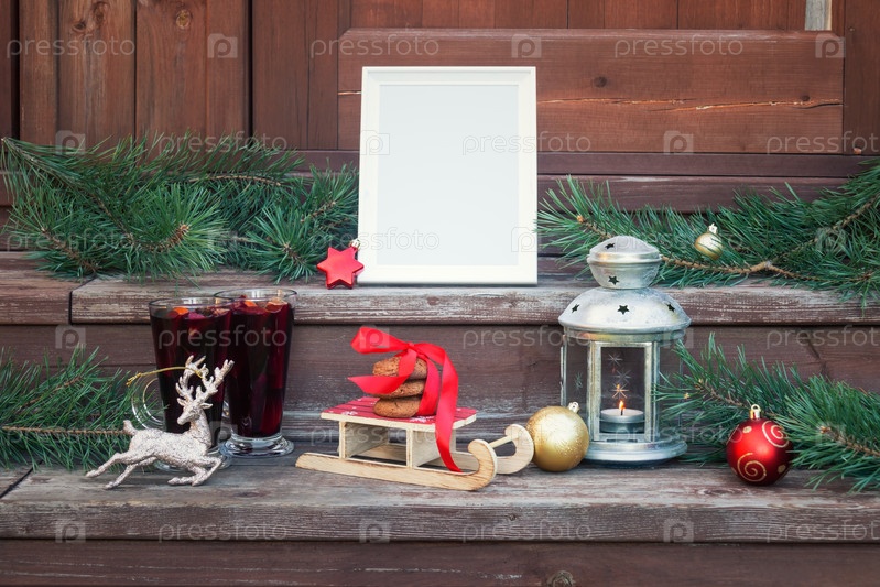 Рамка, бокалы с глинтвейном, печенье, горящий фонарь, рождественские украшения и сосновые ветки на ступенях деревенской деревянной лестницы. Рождественская концепция