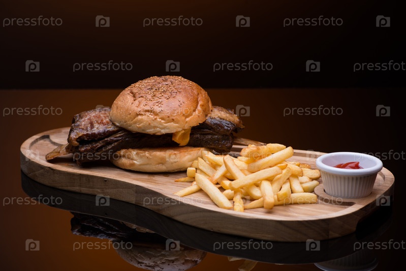 Жаркое с картофелем фри на деревянном подносе
