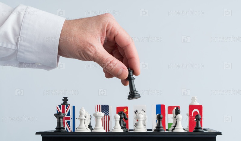Рука политика двигает шахматную фигуру. Концептуальное фото политической игры и стратегии