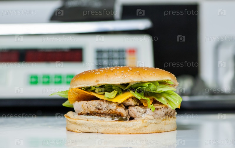 Сочный чизбургер на фоне кухонных весов. размытый фон
