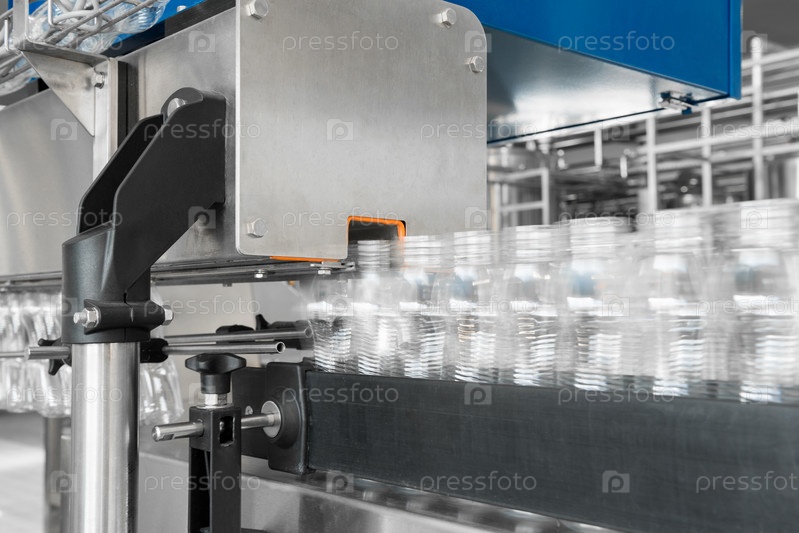 Пустые пластиковые бутылки на конвейерной ленте. оборудование на молочном заводе