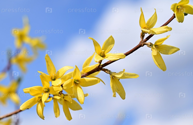 Макро фото цветков форзиции. Желтая цветущая текстура на фоне голубого неба, цветущая форзиция с избирательным фокусом