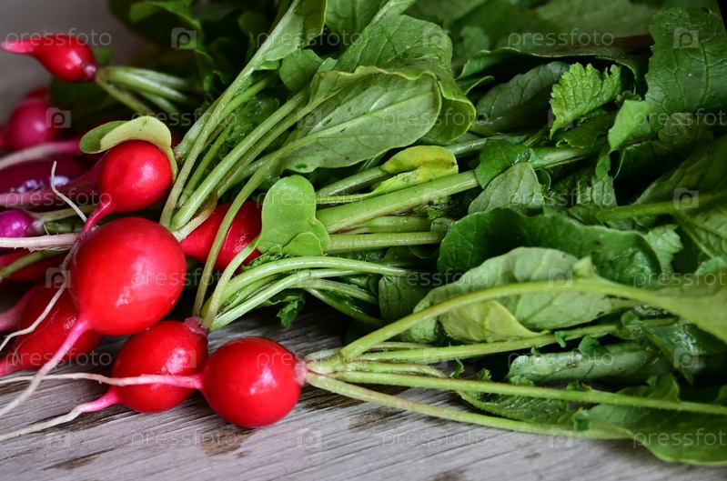Свежий красный редис в белом дуршлаге. Фермерские органические овощи. Серый фон. Вид сверху