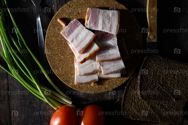 Сало с черным хлебом и зеленым луком на темном фоне, русская национальная еда
