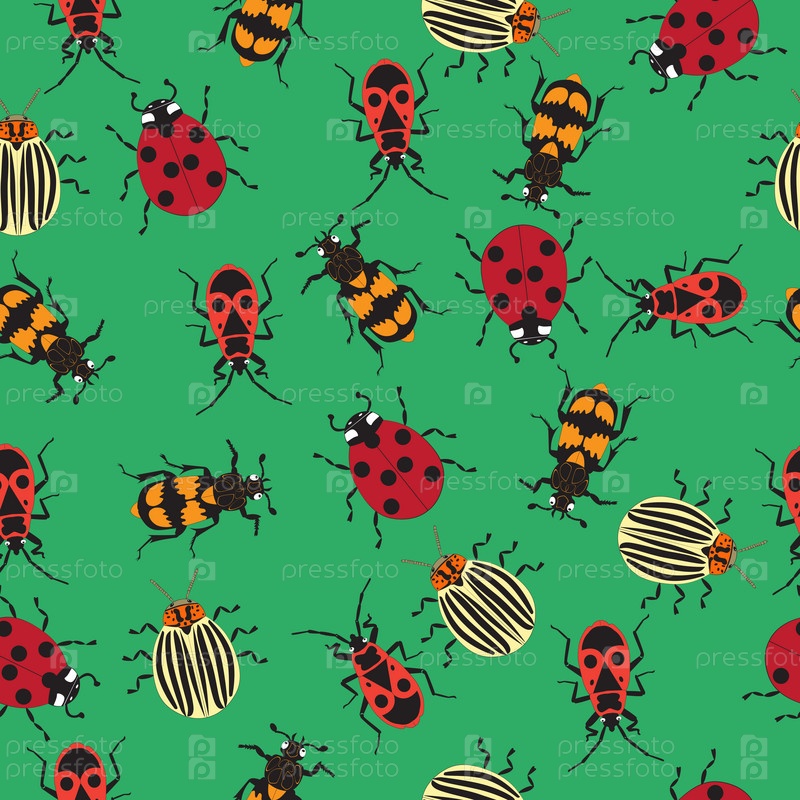 Бесшовная текстура с изображением насекомых: божья коровка, клоп, колорадский жук, жук-могильщик