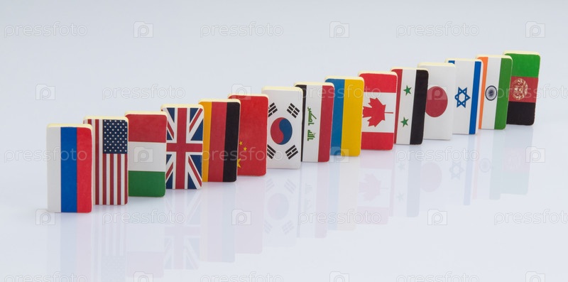 Эффект домино с плитками флагов разных стран мира. концептуальное фото, политические игры. Студийная съемка