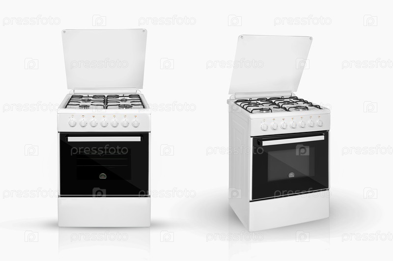 Современная бытовая кухонная печь в двух положениях обзора на белом фоне. кухонные приборы. Изолированный