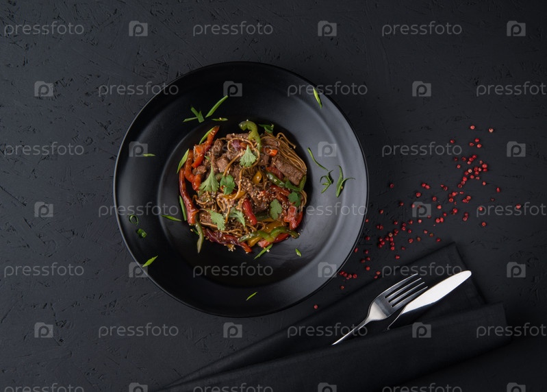Блюдо из мяса на гриле на черной деревянной поверхности, вид сверху