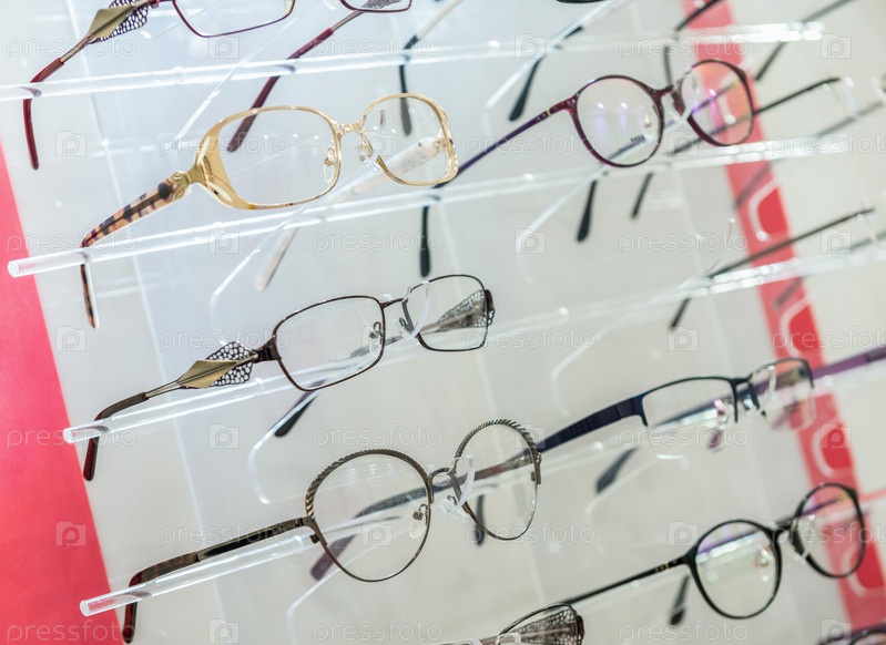 Разнообразные медицинские и солнцезащитные очки на стенде в магазине