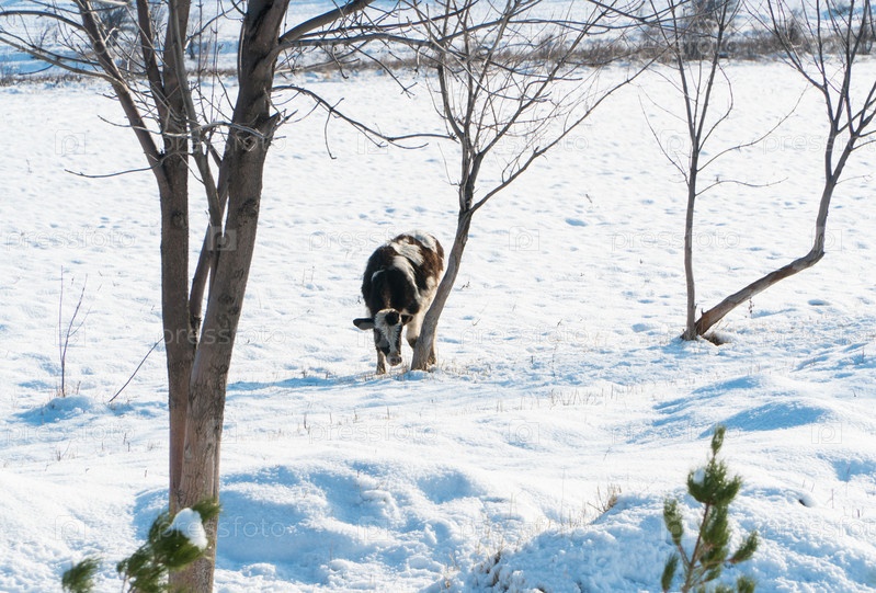 Корова на заснеженном поле в солнечный день