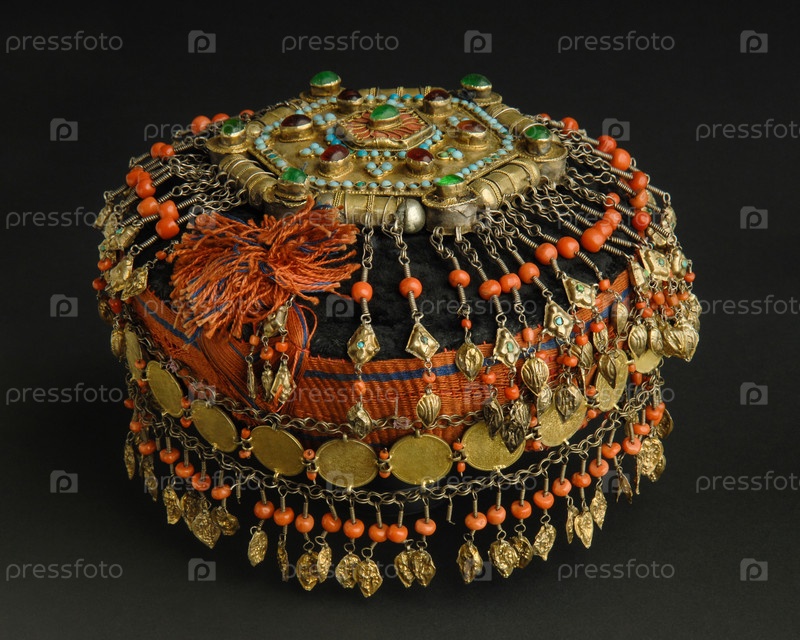 Древняя антикварная кепка с камнями на черном фоне. Среднеазиатские винтажные украшения