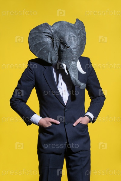 Мужчина в костюме и маске слона на желтом фоне. Концептуальный бизнес фон