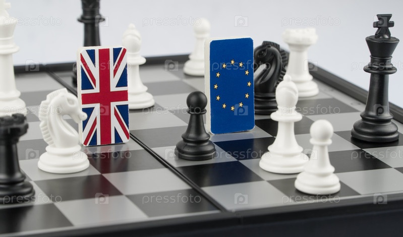 Шахматные фигуры и флаги Европейского Союза и Великобритании на шахматной доске.Концепция политической игры и шахматная стратегия Brexit