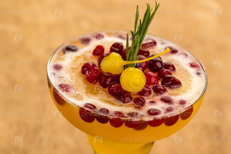 Желтый фруктовый коктейль с ягодами на светло-коричневом фоне, крупным планом